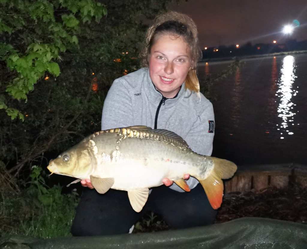Jednak rozmiar nie miał w tym wypadku znaczenia – pierwsza ryba dawała nadzieje na kolejne brania. Po szybkiej sesji zdjęciowej ryba w dobrej kondycji wróciła do wody. Pozytywnie naładowani położyliśmy się spać. Niestety – więcej nocnych brań nie uraczyliśmy. Gdy obudziłam się około 6 rano, postanowiłam przerzucić wędki i ponownie oddać się w objęcia Morfeusza. Nie zdążyłam na dobre zasnąć i kolejna rooolka wyrwała mnie ze śpiwora. Finalnie nie wiem co zajęło więcej czasu – wyholowanie amura czy budzenie Daniela do pomocy. Pewnie gdyby ryba była większa, krzyczałabym trochę głośniej 🙂 Tym razem branie nastąpiło spod drzewa, wychodzącego z brzegu nad taflę wody. Ryba skusiła się na pojedynczą kulkę tonącą na włosie.