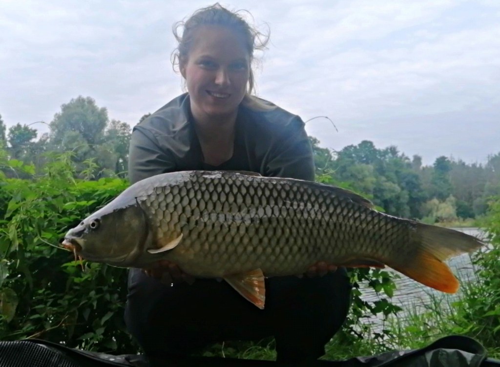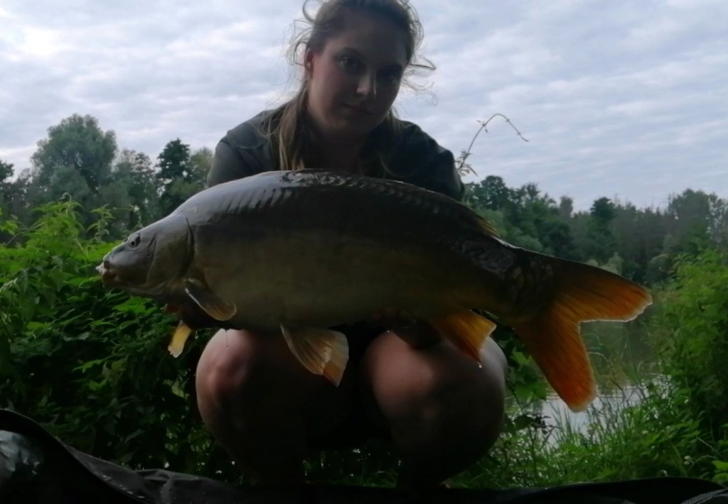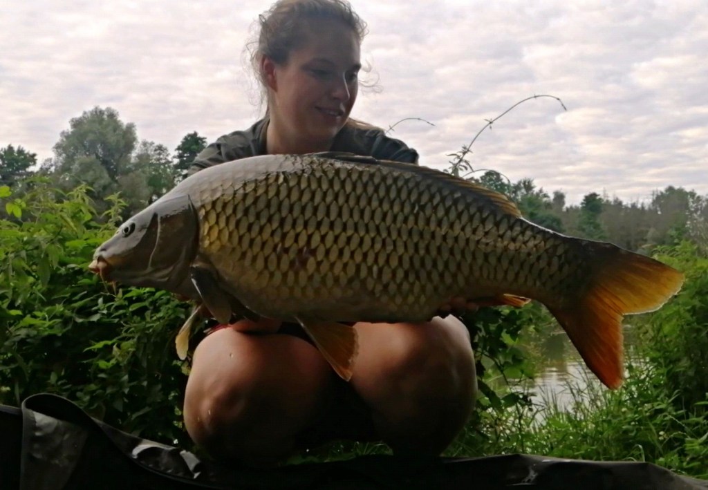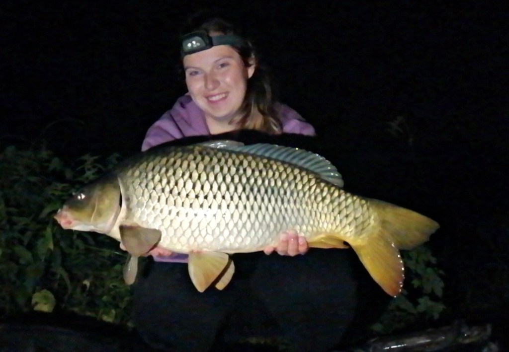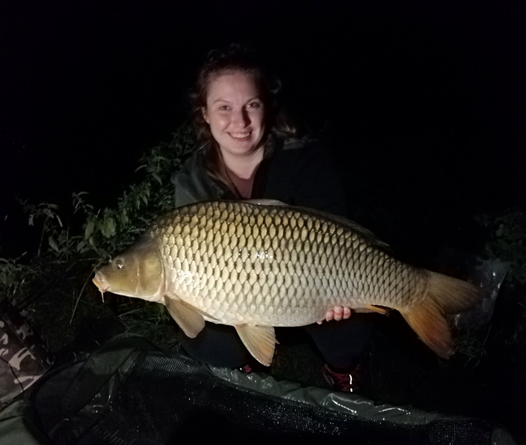 Do zmierzchu nastąpiło już tylko jedno branie, które ponownie zakończyło się spinką w zaczepie. W głowie miałam wiele słów, jednak wiedziałam, że nic z tymi nieszczęsnymi bojkami nie zrobię. Postanowiłam więc, że wyrażę moje niezadowolenie z umieszczenia tych bojek w tym tekście 🙂 Kolejne branie nastąpiło dopiero około 1.30. Szybka rolka z miejsca, które często było źródłem spinek postawiło mnie na równe nogi. Bardzo szybko wybiegłam z namiotu ( czego zwykle nie robię) i zacięłam wędkę od razu przesuwając się w prawo próbując odciągnąć rybę od zaczepu. Udało się ! Ryba wyszła na otwartą wodę. Byłam już o wiele spokojniejsza i zaczęłam skupiać się na tym jak bardzo chce mi się spać 🤣 Jak się okazało po niespełna 15 minutach był to kolejny karp pełnołuski. Zaczęłam się zastanawiać, czy tylko ja odławiam te złote rybki z taką częstotliwością? Na większości łowisk karp pełnołuski jest rzadkością. Tutaj jest on bardzo często spotykany.